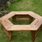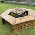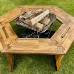 このテーブルの一番のポイントは焚火台やロースタイルのバーベキュウコンロを取り囲んで快適に楽しい時間を過ごせる事です。